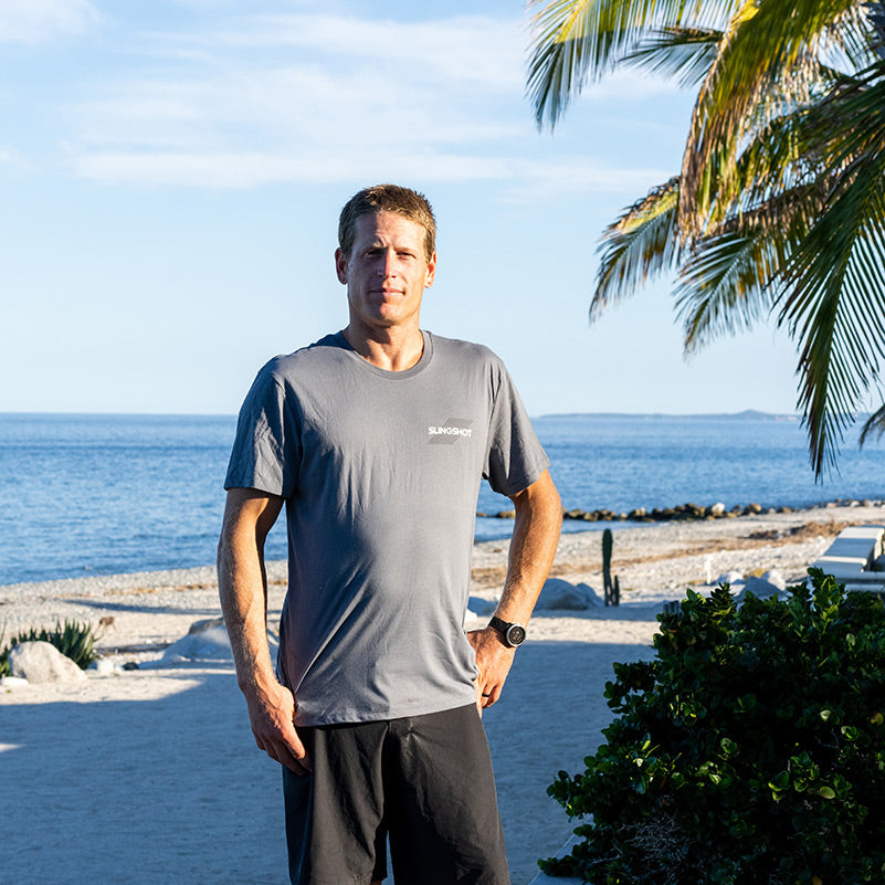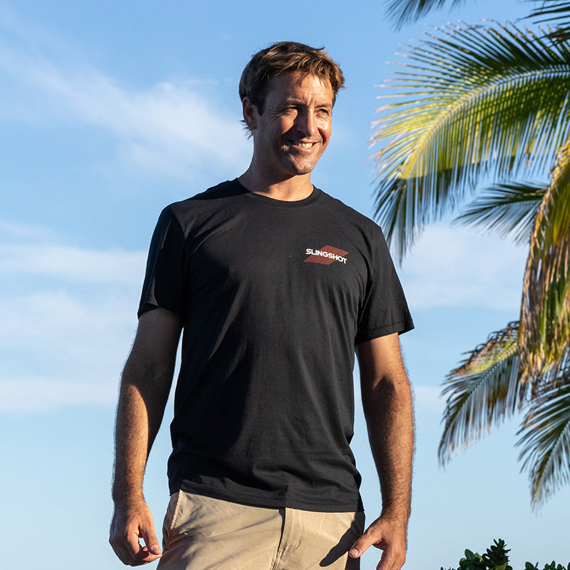 Tee-shirt noir ou gris de coupe classique avec logo Slingshot . Tee-shirt 100 % coton biologique